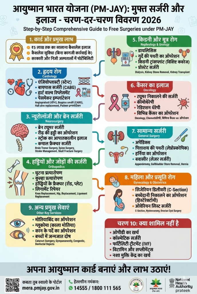 इस योजना के तहत प्रत्येक पात्र परिवार को प्रति वर्ष 5 लाख रुपये तक का मुफ्त स्वास्थ्य बीमा (Cashless Health Insurance) दिया जाता है। लेकिन, सबसे बड़ा सवाल जो अक्सर लोगों के मन में उठता है— “आखिर इस आयुष्मान कार्ड से कौन-कौन सी बीमारियों का इलाज और सर्जरी फ्री में होती है?” अगर आप भी इंटरनेट पर “आयुष्मान योजना फ्री सर्जरी लिस्ट” या “Ayushman Card Operation List“ तलाश रहे हैं, तो आप बिल्कुल सही जगह पर आए हैं। इस विस्तृत आर्टिकल में हम आपको बताएंगे कि आयुष्मान कार्ड से आप किन-किन गंभीर बीमारियों के ऑपरेशन और सर्जरी पूरी तरह से मुफ्त में करवा सकते हैं।